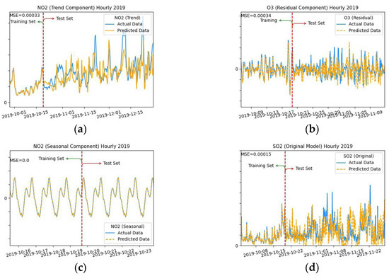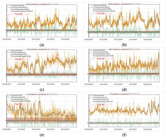 Figure 7 shows all the test results of prediction for the concentration of those six air pollutants by the proposed MTS-DR model after training and predicting MTS, which is decomposed by the additive method. Thus, as Equation (8)