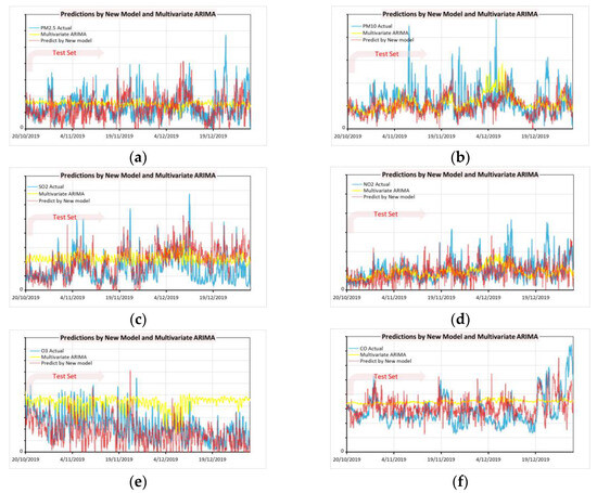 Comparison of the predictions by MTS-DR and ARIMA models: (a) PM2.5; (b) PM10; (c) SO2; (d) NO2; (e) ozone; (f) CO.