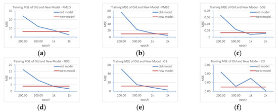 Comparison of the training MSE of old and MTS-DR models: (a) PM2.5; (b) PM10; (c) SO2; (d) NO2; (e) ozone; (f) CO.