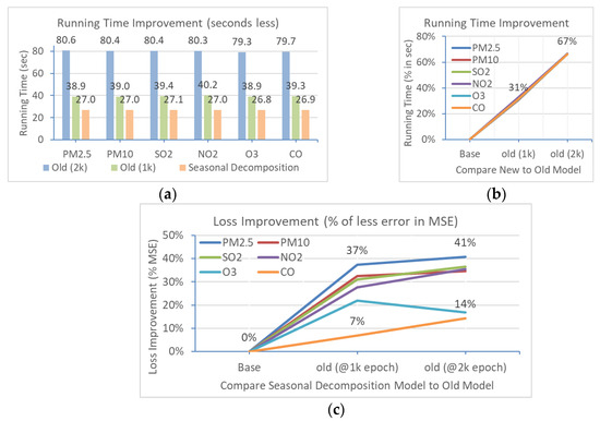 The percentage increase in efficiency and performance in this area is significant. The accuracy has improved from 37% to 41%, 32% to 35%, 31% to 37%, 28% to 35%, 17% to 22%, and 7% to 14% for PM2.5, PM10, SO2, NO2, ozone, and CO, respectively. The training time is reduced from 31% to 66% for all six air pollutant elements (see Figure 9). How to shorten the running time is helpful sometimes when the system is designed for real-time monitoring. The big O is a common method to measure and estimate the running time. For the training time of an ANN-type model, if the algorithm adopted is simple, the big O will be O(n) so that if the multivariate input size increases, the running time will be multiple, e.g., the time needed will increase from t to 10t when the input size increases from 1 to 10. However, if the model is complicated and has an algorithm that leads to a large O O(n2), then the running time will be exponentially increased to 102 × t, i.e., from t to 100t. Thus, the reduction in the number of epochs could be a significant contribution to the performance of the ANN-type models.