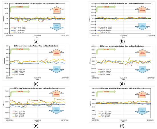Differences in actual to predicted data (y-axis y = a − p; where a is actual data, p is predicted data): (a) PM2.5; (b) PM10; (c) SO2; (d) NO2; (e) ozone; (f) CO.