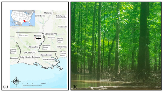 (a) Location map showing the study area, the Russel Sage Wildlife Management Area in northeast Louisiana, with the position of the US-ULM tower location indicated by the arrow tip, and (b) the study site shown flooded, as is typical during the late winter and early spring (Photo: J.B.).