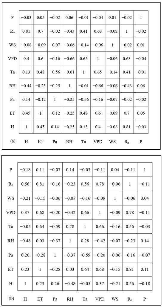 As a preliminary investigation of the relationships, Figure 2 shows the correlation matrices among all variables for all seasons at the hourly, daily, and weekly timescales. ET was moderately (| r | > 0.2) or highly correlated (| r | > 0.5) with Rn, VPD, sensible heat, and temperature at all timescales. Precipitation was weakly correlated with ET at all timescales, with positively increasing coefficients at higher timescales. Interestingly, windspeed showed a weak negative correlation at the hourly timescale, with an increasing negative correlation at the daily and weekly timescales. The strength of the correlation between Rn, H, and VPD was dependent on the temporal scale of the comparisons. Further, temperature and VPD showed a strong correlation with increasing coefficients at larger timescales.