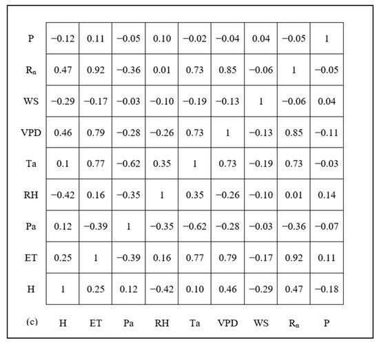 Correlation matrices among all variables: sensible heat flux (H), evapotranspiration (ET), pressure (Pa), relative humidity (RH), temperature of air (Ta), Vapor Pressure Deficit (VPD), windspeed (WS), net radiation (Rn), and precipitation (P) for all seasons at the (a) hourly, (b) daily, and (c) weekly timescales.