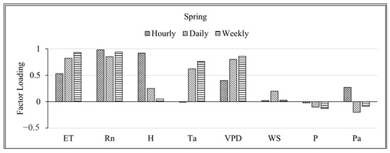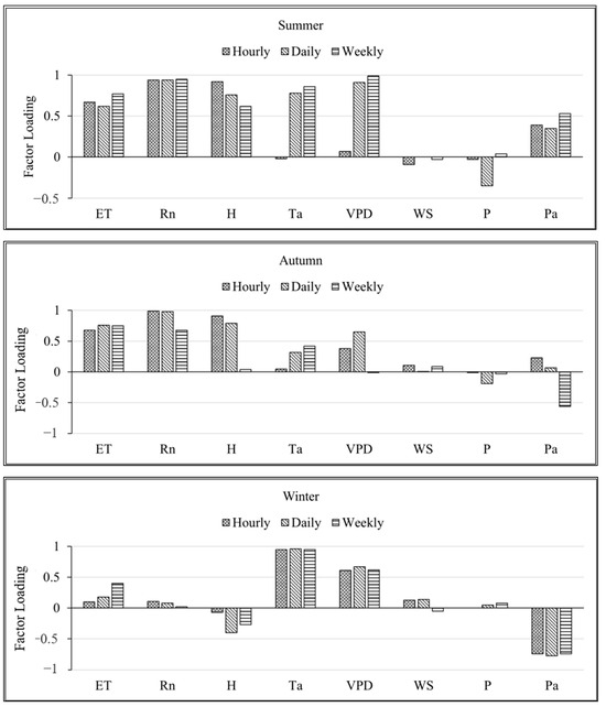 ET, Rn, sensible heat flux, temperature, and VPD all loaded highly positive on the first factor for all seasons except for the winter season, where ET and Rn loaded comparatively lower than VPD and temperature. Also, sensible heat flux and pressure loaded highly negatively in winter. Windspeed and rain (precipitation) showed low factor loadings, as they become highly variable as the timescale increases and seasons change.