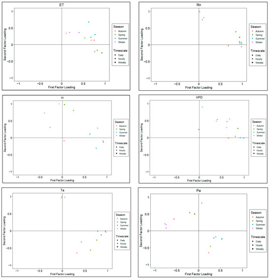 Score plots of the first and second factor loadings by various timescales across different seasons. Variables include evapotranspiration (ET), net radiation (Rn), sensible heat flux (H), Vapor Pressure Deficit (VPD), temperature of air (Ta), pressure (Pa), windspeed (WS), and precipitation (P).