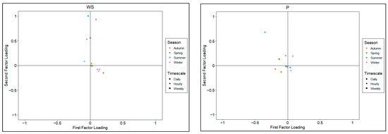 The factor analysis yielded multiple factor loadings, with the first factor capturing approximately 60% of the variability in the dataset. The first and second factor loadings for all variables are shown in score plots in Figure 4 with groupings similar to that in Figure 3. Factor loading pairs were categorized by color for seasons and markers for timescales (hourly, daily, and weekly). Score plots revealed the spread of first and second factor loadings across seasons and timescales.
