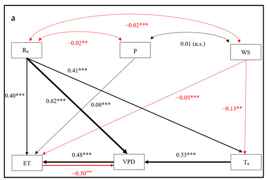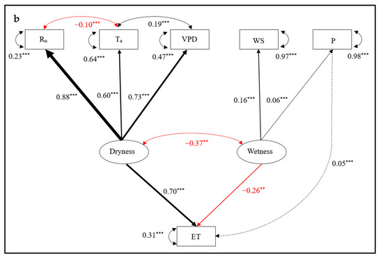 The (a) path diagram and (b) SEM of all the observed variables (ET, Rn, Ta, VPD, WS, and P) and latent constructs (dryness and wetness) within the path analysis with positive (black) and negative (red) path coefficients for hourly timescale across all seasons. The dashed line indicates direct contribution. The * sign indicates significance level and n.s. indicates non-significance.