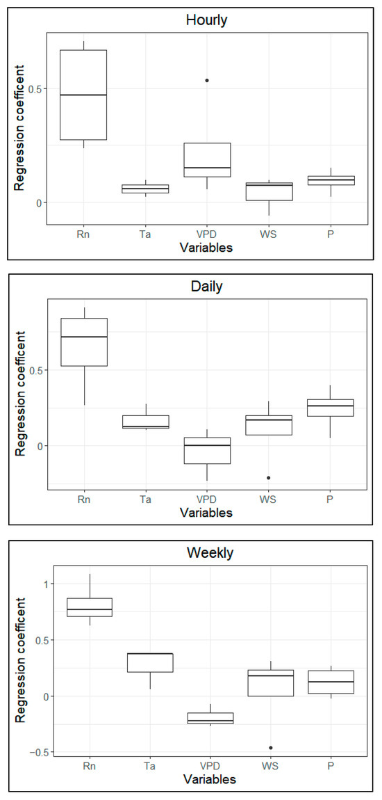 The combined results of the path analysis with significant regression coefficients for different variables at hourly, daily, and weekly timescales are shown in Figure 6. Rn stood out, with the highest median regression coefficient for all the timescales. VPD had the second-highest independent contribution to ET variability on the hourly scale, while rain and temperature showed the same at the daily and weekly timescales, respectively. The windspeed showed lesser influence at the hourly timescale, while this increased for the daily and weekly timescales. To test the significance of differences in the regression coefficients of different variables across these timescales, an ANOVA test was performed for all the categories. The results showed significant differences (p < 0.05) in regression coefficients on all timescales for all variables. This was followed by a Tukey HSD post hoc analysis to test the significance for pairwise differences in regression coefficients. Only the regression coefficients for Rn showed significant differences from that of other variables. Thus, it was concluded that Rn is the major direct driver of ET variability in this ecosystem across all timescales.