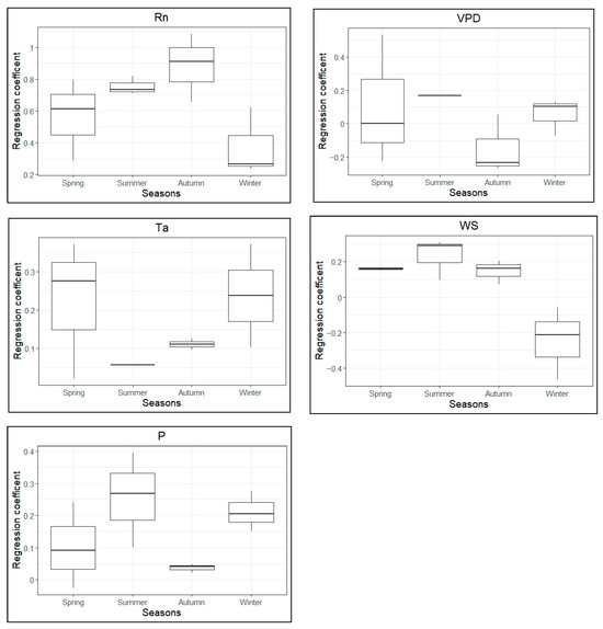 Similar to Figure 6, the path analysis results were compared for all the variables with significant path coefficients across seasons. The distributions of path coefficients for each variable during the spring, summer, autumn, and winter seasons are shown in Figure 7. Rn had the highest regression coefficient for the autumn season, followed by summer and spring. In winter, the independent contribution of Rn was the lowest in determining the variability in ET. However, VPD showed the least contribution to ET variability in the autumn season, which became maximum in the summer season. This revealed the VPD-dependent driving force in summer seasons when there is an abundant amount of water vapor in the atmosphere. The effect of temperature was observed to be greater during the spring and winter seasons compared to the summer and autumn seasons. Windspeed and rain had the highest impact during the summer season. The lesser effect of rain on ET variability during spring and autumn suggested there was sufficient water available for ET.