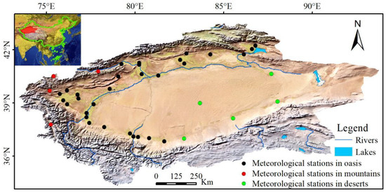 The territory of the study area. Located in northwestern China, lies between Tianshan Mountain, Kunlun, and Altun Mountain. The black, green, and red circles represent stations in oases, desert, and mountainous terrain, respectively.