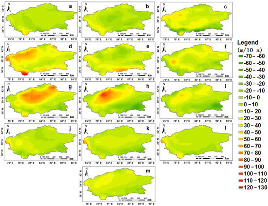 The trend analysis of the Atmospheric Boundary Layer Height (ABLH) data from ECMWF for the period 1979–2018 revealed both upward and downward trends, represented by the colors red, yellow, and green. Figure 3 illustrates the monthly trends of ABLH in the Tarim Basin. In January, the annual ABLH tendency rate ranged from −30 to 60 m/10 a. The lowest value of −30 m/10 a was observed in the eastern and southeastern parts of the basin, while the highest value of 60 m/10 a was observed in the eastern and southwestern parts. Most areas in the basin showed an upward trend, with a tendency rate of approximately 10 m/10 a. In February, the annual ABLH tendency rate ranged from −50 to 50 m/10 a. The lowest value of −50 m/10 a was observed in the southern part of the basin, while the highest value of 50 m/10 a was observed in the southwestern part. Similar to January, most areas showed an upward trend. In March, the annual ABLH tendency rate ranged from −110 to 70 m/10 a. The lowest value of −110 m/10 a was observed in the southern part, mainly in mountainous areas, while the highest value of 70 m/10 a was observed in the western part. Significant high-value centers were found in the south, southwest, and west, indicating an upward trend in most areas. For April, the ABLH tendency rate ranged from −10 to 130 m/10 a. The lowest value of −10 m/10 a was observed in the northern and northeastern parts of the basin, while the highest value of 130 m/10 a was observed in the southern part. Significant high-value centers were present in the west, with a low-value center in the east of the desert. Most parts of the study area showed an upward trend in ABLH. In May, the ABLH tendency rate ranged from −30 to 70 m/10 a. The lowest value of −30 m/10 a was observed in the northern, eastern, and western parts of the basin, while the highest value of 70 m/10 a was observed in the southern part. Significant low-value centers were found in the east, west, and north, with a high-value center in the south of the desert. The height of the boundary layer showed an increasing trend in most parts of the study area. In June, the ABLH tendency rate ranged from −30 to 60 m/10 a. The lowest value of −30 m/10 a was observed in the eastern and southwestern parts of the basin, while the highest value of 60 m/10 a was observed in the northeastern and southeastern parts. There was a dominant upward trend in the height of the boundary layer, while the surrounding mountains showed a downward trend. In July, the ABLH tendency rate ranged from −30 to 100 m/10 a. The lowest value of −30 m/10 a was observed in the surrounding mountains of the basin, while the highest value of 100 m/10 a was observed in the northeastern and central parts of the desert. There is an evident zonal distribution from the center of the desert to the surrounding regions.
