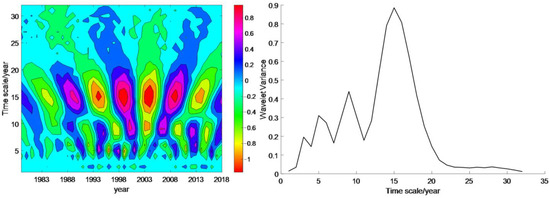 Wavelet analysis was employed to detect periodic changes in ABLH. Figure 5 illustrates the wavelet variances of ABLH from 1979 to 2018. In this plot, a positive real part corresponds to the annual average ABLH during a high (increasing) period, while a negative real part indicates that the annual average ABLH belongs to a low (decreasing) period. Figure 5 shows a real-line contour plot of the Morlet wavelet coefficient of the annual average ABLH in the Tarim basin. It reveals four main cycles of ABLH: 2-, 5-, 9-, and 15-year cycles. Among these cycles, the time scale of approximately 15 years corresponds to the most significant variance-extreme value, followed by 9 and 5 years. The annual changes of about 2 years are too rapid and relatively insignificant.