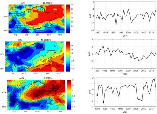 The EOF method is used to calculate orthogonal functions, representing spatio-temporal components. Each component may represent a changing characteristic of the variable [39]. The EOF method provides the spatio-temporal change patterns of the variable [40].