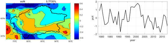 The third mode accounted for 10.9% of the total change, with the strongest positive loadings observed in the center of the desert and negative loadings in the surrounding regions of the Taklamakan Desert. The strongest negative value was recorded in 1984, while the strongest positive value was observed in 2012.