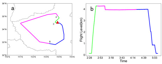 An aircraft cloud-seeding operation was carried out in Henan Province for the cloud. The aircraft took off from Zhengzhou Xinzheng Airport at 02:30 (point C in Figure 1a, the red triangle) and returned to the airport at 05:07. The catalyst seeding time period was 96 min, from 02:47 to 04:23 (points A–B in Figure 1a). The seeding height was 3930 m–4263 m, the temperature was about −8 °C to −10 °C, and the height of the 0 °C layer was about 845 m. The flight path of the aircraft is shown in Figure 1.