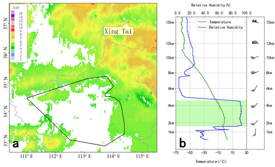(a) FY-4A cloud top height and a portion of the flight path (black line) at 00:00 on 15 December 2019; (b) L-band radiosonde plot at Xingtai at 0800 h. The green line is the temperature, the blue line is the relative humidity curve, and the black lines are wind barbs. Green shades mark the cloud cover.