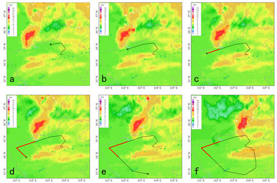 The FY-4A cloud-top height and the aircraft flight track at different times during the cloud-seeding operation on 15 December 2019: (a) 03:00; (b) 03:15; (c) 03:30; (d) 03:49; (e) 04:23; (f) 05:30. The red line is for the period with supercooled water reported.