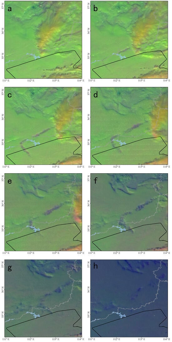Figure 4 shows the FY-4A tri-channel-fused cloud images at 04:15 (a), 04:45 (b), 05:15 (c), 05:45 (d), 06:15 (e), 06:45 (f), 07:15 (g), and 07:53 (h). It can be seen that at 04:15, which was ~60 min after the cloud seeding (following the seeding period of 03:15~03:49), the influence of the cloud-seeding operation, i.e., the cloud track, was first observed, and crystallization began at this time. By 04:45 (90 min after the cloud seeding), a cloud track very similar to the trajectory of the aircraft cloud seeding appeared on the cloud image.