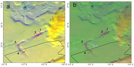 (a) Tri-channel fusion cloud image of the FY-3D polar-orbiting satellite at 05:40 on 15 December 2019; (b) that of the FY-4A satellite at 05:38. The black line marks the flight path of the aircraft, and the red lines represent the four cross-sections examined (see the red lines).