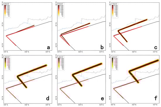is the positional spatial location of the aircraft at , and the dispersion coefficient is generally taken as m2/s, m2/s for stratiform clouds by Zhou et al. [5]. Considering that each section of aircraft broadcasting is not a point source but has a certain initial width and length, it will be closer to the actual situation to simulate it by giving an initial time in the calculation, and here we take 10 s for . While in Equation (2) can be viewed as the point source concentration at the , for the interval time period, where R is the seeding rate (number/s), as shown in Equation (3):