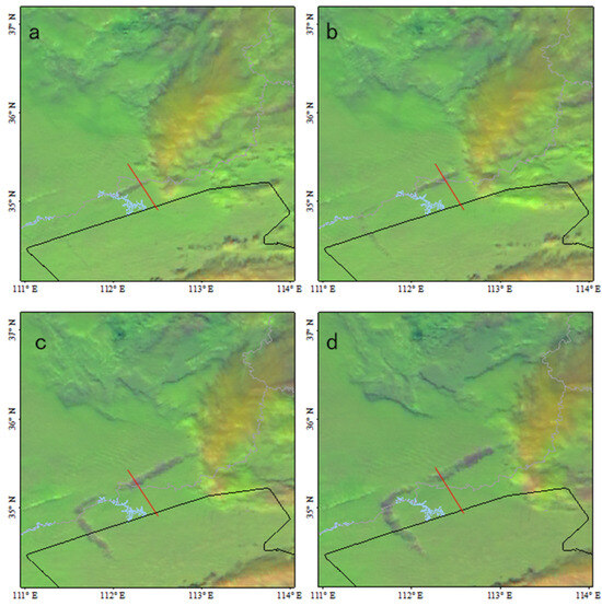 FY-4A tri-channel fused cloud images at different times on 15 December 2019: (a) 04:35; (b) 04:45; (c) 05:15; (d) 05:30. The red line is for the fixed space position selected. The black line marks the aircraft’s flight path.