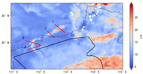 Contemporary geostationary satellites provide minute-level, high-resolution cloud observations and present the capability of obtaining the evolution of detailed cloud structures, including cloud-seeding cloud tracks. FY-4A is a geostationary meteorological satellite that was successfully launched on 11 December 2016. It carries the Advanced Geostationary Radiation Imager (AGRI) with 14 channels, capable of achieving regional 5 min and global 15 min cloud maps for continuous observation of cloud evolutions [10]. Since 2017, the National Satellite Meteorological Centre has been operationally releasing cloud products with high temporal and spatial resolution (5 min interval) from the FY-4A satellite, including the cloud-top height, cloud-top temperature, cloud effective particle radius, and cloud optical thickness [11]. The quality of the data is comparable to the accuracy of similar cloud products from Himawari-8 [12]. These FY-4A products have been used to study the microphysical evolution of clouds [13,14,15,16].
