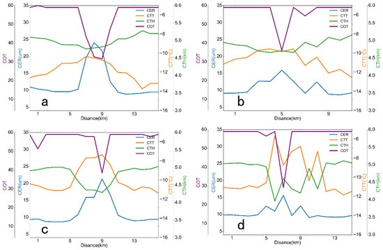 Figure 10 shows that the cloud-top height inside the cloud track decreased, corresponding to an increase in the cloud-top temperature. For segment 1, the cloud-top height inside the cloud track was about 4.7 km, and in the surrounding area, it was about 5.1 km, an increase of 0.4 km. Correspondingly, the cloud-top temperature inside the cloud track was warmer than the outside (−10.3 °C vs. −12.5 °C). For segment 2, the cloud-top height inside the cloud track was about 4.6 km, a decrease of about 0.3 km compared to the outside. Similar results were obtained for the other two segments.