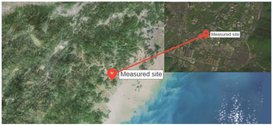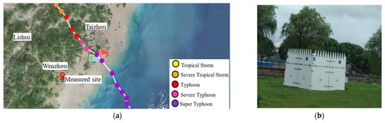The measurement site is located in the northern campus of Wenzhou University, Ouhai District, Wenzhou City, Zhejiang Province, which belongs to the southeastern coastal area with many bays. The topography of the measurement point and its surrounding area is shown in Figure 2. About 2 km east of the measured point is Daluo Mountain, with the highest altitude of 707.4 m. The southeast side is about 17 km away from the coastline of the East China Sea, where a large number of typhoons land or pass through every year. The northeast side has the second largest river in Zhejiang, the Oujiang River; the northwest side is the open Sanyang wetland, and the west side is the urban area of Wenzhou, which belongs to the suburbs of the city. The distance between the typhoon landing site and the observation point is about 82 km. During the typhoon period, at 3:00 on 10 August 2019, the observation point is the closest distance from the typhoon center, about 70.8 km, and the intensity level of the typhoon is a strong typhoon at this time.
