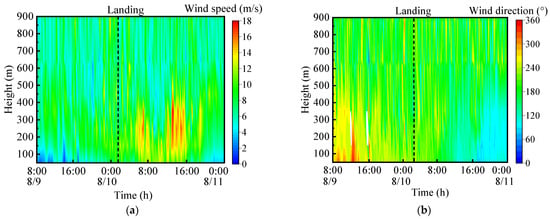 Intervals 6–8 (18:00 on the 9th to 0:00 on the 10th): As the distance between the typhoon center and the observation point decreases, the height of the maximum wind speed decreases from 300 m to 120 m, and the wind speed profile at the bottom shows anti-C shape; the horizontal average wind speed gradually increases, and the 10-min average wind speed below 500 m can reach 14 m/s. In Figure 5, the wind direction gradually rotated counterclockwise, the wind direction at the lower level was stable, and the wind direction above 750 m was relatively discrete.