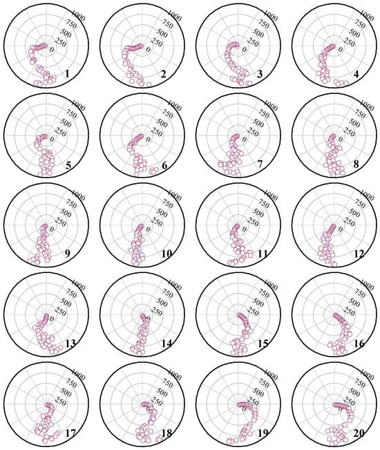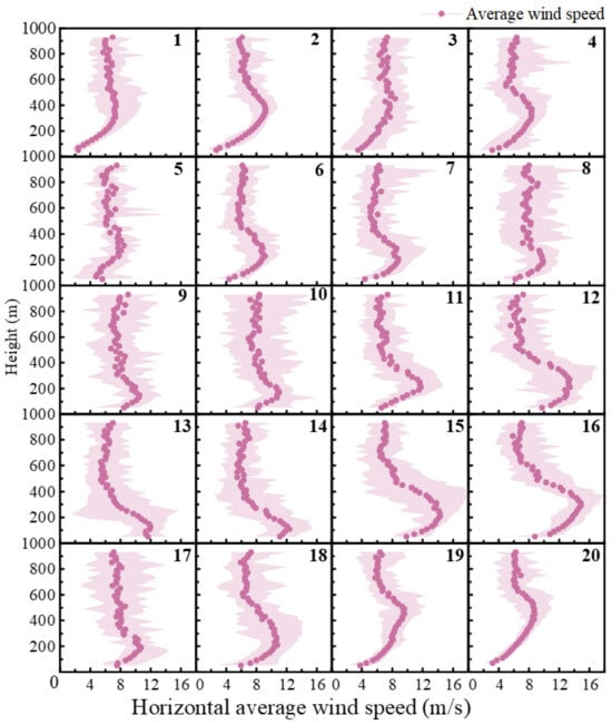 The analysis of the evolution of the typhoon boundary layer wind profile from 8:00 on 9 August 2019, to 0:00 on 11 August 2019, based on the measured points within the influence range of the typhoon’s 7th level wind circle, lasted a total of 40 h. Figure 4 and Figure 5 show the evolution process of the measured boundary layer wind speed and wind direction profiles of typhoon Lekima, respectively. Each interval is divided based on 2 h, for a total of 20 intervals. Figure 4 also provides the extreme and peak values of the average wind speed span for each interval. The dotted line in the figure is the average wind speed profile in each interval, and the shaded part represents the peak of the horizontal average wind speed in this time interval. In Figure 5, the wind direction is 0° (360°) due north and 180° clockwise due south. The vertical height is 0 to 1000 m.