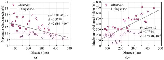Changes of maximum wind speed and height of maximum wind speed with relative distance, including (a) maximum wind speed; (b) maximum wind speed height.