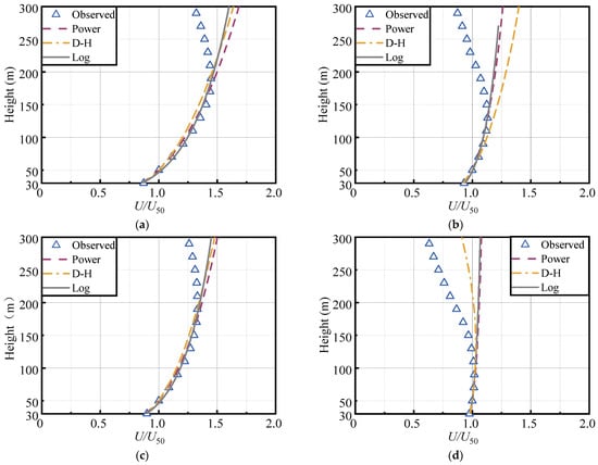 Comparison of wind profile and fitting model of typhoon with different wind speed classes, including (a) 6 < U50 < 8; (b) 8 < U50 < 10; (c) 10 < U50 < 12; (d) 12 < U50 < 14.