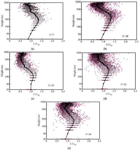 To study the influence of the average typhoon wind direction on the wind profile characteristics, the average wind speed at a height of 50 m (U50) is used as the normalization to process the measured wind speed data at different heights with a basic time interval of 10 min. Considering the topographic effect near the observation point, the measured wind speed data at different heights are grouped based on the average wind direction at a height of 50 m. With a wind direction interval of θ = 45°, the north direction is defined as 0° and divided into eight groups θi, i = 1, 2, 3, …, 8, which are 0°~45°, 45°~90°, 90°~135°, …, 315°~360°, respectively. To avoid the influence of the thermal effect, the wind data with wind speed less than 6 m/s are eliminated in the preprocessing of wind direction data. The average wind profile in each direction is shown in Figure 9. The missing wind direction intervals indicate that there is no data in that direction during the measurement period, or the data in that direction are removed because the wind speed at a height of 50 m is less than 6 m/s. The black squares in the figure represent the average wind speed records in each direction interval at each height level, the red dots represent all the measured data at each height level in that direction interval, and the black horizontal bars are error bars, indicating the standard deviation of that layer. N represents the number of sets of measured data in that direction interval that meet the conditions.
