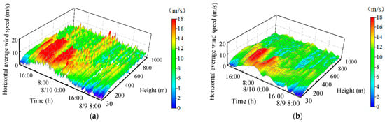 Figure 11 shows the time history of the horizontal wind speed at different altitudes and different time distances. Part of the white space in the figure is caused by data quality control. From the wind speed time-history curve, it can be seen that with the increase of the average time interval, the average wind speed at heights of 600–1000 m decreases significantly. The larger the time interval, the gentler is the three-dimensional wind speed surface, indicating that the changing trend of the average wind speed with time interval becomes more stable. In the figure, the 10-min average wind speed time-history curve basically fluctuates around the 60-min time-history curve. Compared to the 10-min average wind speed interval, the 60-min average wind speed interval is no longer able to reflect the development trend of wind speeds at different heights during the passage of typhoons. Using a 10-min average wind speed interval to represent the intensity of the average wind is considered more reasonable by our country’s standards.