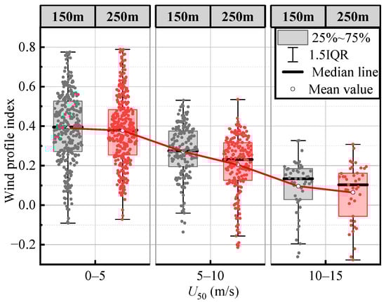 Figure 12 shows the change in typhoon wind profile index with 50 m average wind speed (0–5, 5–10, and 10–15 m/s) and vertical height (150 m and 250 m). In different height levels, the wind profile exponent tends to decrease as the average wind speed increases. Within the same wind speed group, the average wind profile exponent also decreases with increasing height. With the increase of U50, the exponential distribution gradually changes from discrete to convergent. The wind profile exponent within the minimum wind speed range in the 150 m height level is 3.9 times that of the maximum wind speed range. In addition, the U50 is in the range of 10–15 m/s, and there is obviously a negative wind profile index, indicating that the wind profile distribution deviates from the power-law, log-law, and D-H model. There is a phenomenon of low-level jets.