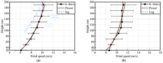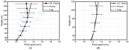 To avoid the influence of the thermal effect, data with wind speed of less than 6 m/s at a height of 50 m were also excluded. Based on the wind speed at the 50 m altitude level, the average wind speed profiles were divided into four groups: 6–8 m/s (46 profiles), 8–10 m/s (34 profiles), 10–12 m/s (37 profiles), and 12–14 m/s (16 profiles). The results show that the average wind velocity profile curve is different with different wind velocities, indicating that the average wind velocity profile curve is related to the wind velocity. The larger the wind speed range, the lower is the height of the maximum wind speed, the more drastic is the change of average wind speed with height, and the steeper is the wind profile curve. It is more obvious when the average wind speed is greater than 12 m/s. This is consistent with the conclusion of Powell [9] and Shu [37] in analyzing the typhoon wind profile. For a weather system with a larger average wind speed, the height of the maximum wind speed is lower.