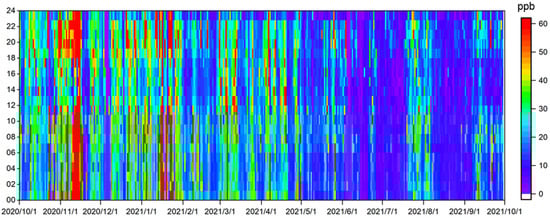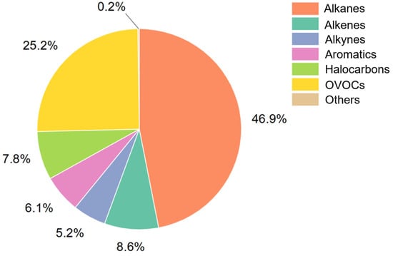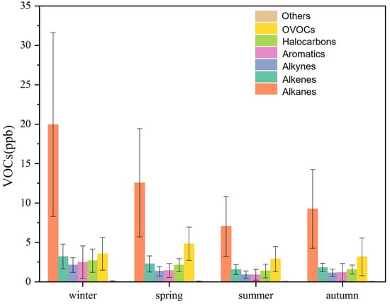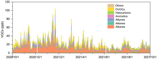 During the period between 1 October 2020 and 30 September 2021, a total of 107 species were identified and determined, including 29 alkanes, 11 alkenes, 1 alkyne, 17 aromatics, 35 halocarbons, 13 OVOCs, and 1 other species (carbon disulfide). Figure 2 shows the daily-averaged concentrations of total VOCs. It can be found that the VOC concentration varied significantly across the entire year, ranging from 3.15 ppb to 136.18 ppb, with an average of 26.37 ppb. The high concentrations (up to 100 ppb) of total VOCs mainly occurred in winter (January 2021 to February 2021). In November 2020 and March 2021, we can also observe high VOC concentrations up to 60 ppb to 80 ppb. As shown in Figure 3, the alkanes, alkenes, alkyne, aromatics, and halogenated hydrocarbons were highest in winter. The high concentration is probably due to the meteorological conditions (i.e., low wind speed, stratification, and slow boundary layer growth) that is favorable for pollutant accumulation in winter. The unregulated high VOC emissions could be another reason for such remarkable lifted-up concentrations. It is worth noting that the OVOCs were found to be highest in spring, which could be attributed to the secondary production of OVOCs. Secondary production of OVOCs was also strong in summer, but the dilution effect could lower the concentrations.