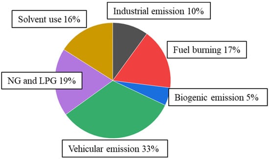 The contributions of the six identified sources are shown in Figure 6. Vehicular emissions contributed the most, taking up 33% of the total VOCs. It was followed by NG and LPG (19%), fuel burning (17%), solvent use (16%), industry emissions (10%), and biogenic emissions (5%). As a typical urban site with road traffic and residential buildings around, the major sources of the measurement point were vehicular emissions and NG and LPG, which are expectable. Fuel burning may include industrial and residential fossil fuel burning as well as biomass burning. However, this study could not distinguish between fossil fuel and biomass burning. The solvent use mainly comes from the use of adhesives for residential purposes and from the shoemaking industry rather than furniture and surface coatings, which are characterized by a high abundance of aromatics. This explained well that the VOC sources are highly dependent on the industry distribution and structure in each specific city. Industry contributed 10% of the total VOCs in Nanning, which was much lower than other highly industrialized cities in China. The biogenic emissions contributed 5% of the total VOCs, which might be due to the urban greening and vegetation areas around.
