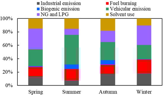 The seasonal variation in the source contributions resolved by the PMF is shown in Figure 7. The vehicular emissions (contributing 44% of total VOC emissions) dominated in summer, probably due to increasing outdoor activities and transportation. The biogenic emissions were much higher in summer and autumn, contributing 7% compared with less than 1% in winter. This is mainly because of the high solar radiation, inducing larger vegetation emission strength. The NG and LPG contributed much more in spring and winter. This is probably because of increasing residential and industrial use of natural gas and LPG during these periods. It was suggested that these variations were highly associated with the human activities in different seasons in Nanning.
