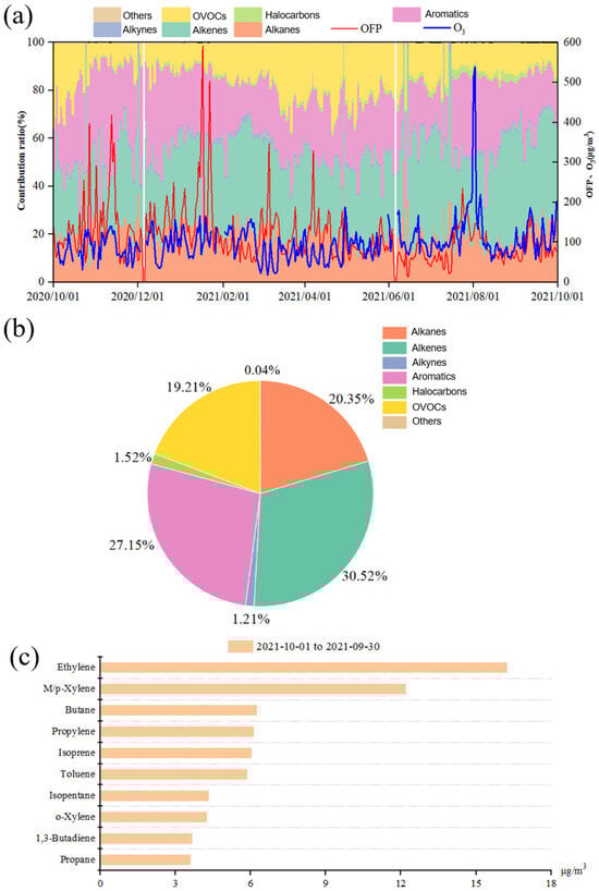 (a) The daily-averaged OFP, (b) function group contribution, (c) and the top 10 species contributing to the OFP.