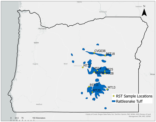 Map showing the spatial extent of the Rattlesnake Tuff in blue. Samples analyzed for this work are shown with yellow dots. Adapted from Streck and Grunder [15]. Samples RST08, RST11, and RST18 were collected in 2018. Sample CVG038 was published in Bershaw et al. [4].