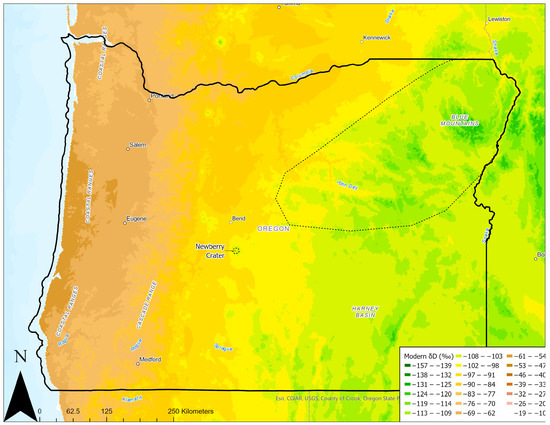 Isoscape showing modern mean annual δD in precipitation. Gridded map data are from Bowen, G.J. [24]. The interpolation methodology is from Bowen and Revenaugh [27]. Data are from GNIP [25] and Welker [26]. The dashed area encompasses the Blue Mountains and Newberry Crater.