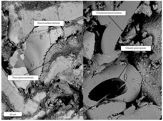 Backscattered electron images of sample MT-13c. The left image was taken within the oxidation rind to show secondary mineralization textures in pore spaces and on shard surfaces. The right image shows fewer secondary minerals forming outside of the oxidation rind. The scale is the same for both images.