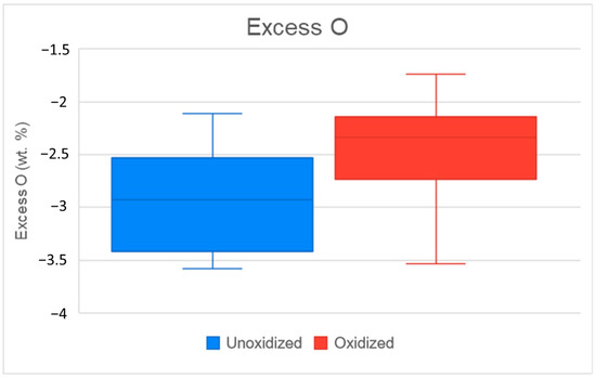 Box-and-whisker plot showing distributions of excess O in both oxidized and unoxidized datasets. Two-mean t-test provides p-values of 0.3452 suggesting there is no significant difference between the mean excess O values.