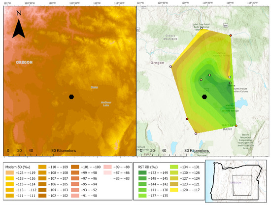 In modern central Oregon, the altitude effect accounts for a significant portion of the localized variation in δD (R2 = 0.34). Areas such as the Blue Mountains in northeastern Oregon and other isolated peaks feature localized depletions in δD associated with increases in elevation (Figure 2). δD values derived from the RST present a similar local pattern of more negative δD centered north–northeast of the Harney Basin, which is its inferred eruptive center [17] (Figure 5). Accordingly, the pattern seen in Figure 5 is consistent with δD depletion due to an isolated topographic high, such as a volcanic dome.