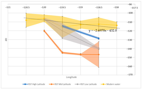 Scatterplot bins average δD every 0.5 degrees longitude. Error bars represent the uncertainty of averaged δD values. δD values for RST were converted to δDwater using the Friedman [7] equation. Significant δD depletion at id-latitude ca. 7 Ma is interpreted to reflect paleotopography. Low, mid, and high latitudes are defined in Figure 5. The trendline represents the equation used to correct for the continental effect.