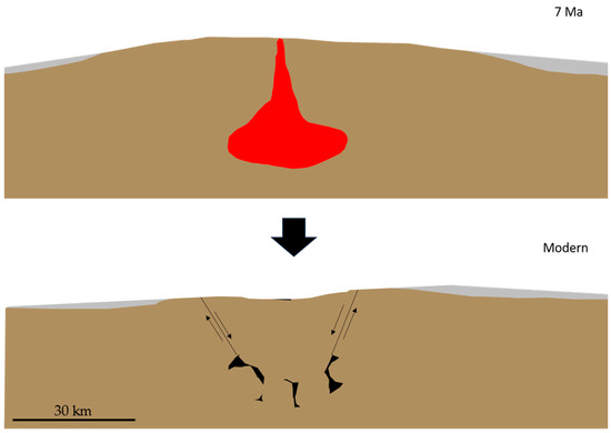 The High Lava Plains province is an area characterized by abundant basalts, andesites, rhyolites, and other intermediate lavas [16,42,43,44]. In the period immediately prior to the eruption of the RST (8–7.1 Ma), significant volumes of flood basalts were erupted and emplaced in areas north and south of the RST eruptive center. These eruptions, which culminated with the emplacement of the RST at 7.1 Ma, were accompanied by significant regional warming. The magmatic warming of the crust may have resulted in regional uplift near the RST eruptive center, causing flood basalt emplacement to occur at the margins of higher topography.