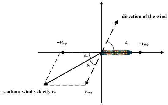 During the navigation of a ship, the natural wind direction is often different from the ship’s navigation direction, so the relative angle between the ship’s heading and the natural wind direction is defined as the yaw angle (θ1), as shown in Figure 1.