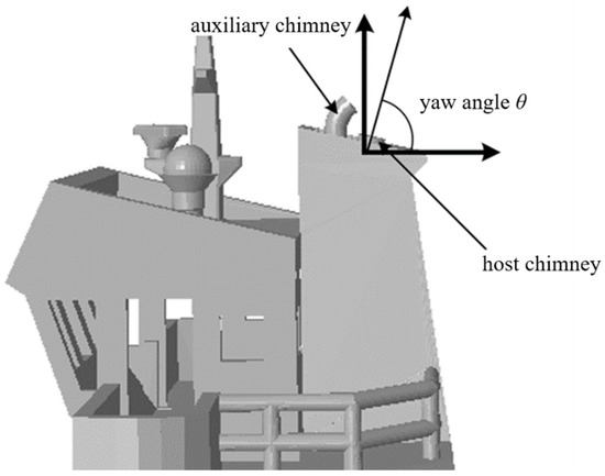 The chimney of a ship includes the main engine chimney and the auxiliary engine chimney. In this study, only exhaust emissions from the main engine stack are considered. Through research, it has been found that the angle of the chimney varies in different ship designs. As shown in Figure 2, the stern direction is the positive direction of the X-axis, and the vertical upward direction is the positive direction of the Y-axis. The inclination angles of the chimney are all in the first quadrant, so this study stipulates that the angle of the chimney is the degree of the angle between the chimney’s central axis and the X-axis, and the counterclockwise direction is the positive direction without considering the negative angle.